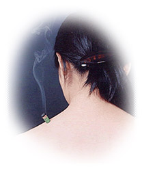 はヨモギの葉の繊維を材料にした柔らかい綿状のモグサを使い、温灸、棒灸と称して皮膚から離して穴を暖めるものや、灸頭鍼と称して鍼の頭にモグサを付けて燃やし、皮膚から離れて穴を暖める方法があります。また、隔物灸と称して、ニンニク、塩、枇杷の葉などを皮膚の上に置いて、その上にモグサをのせて燃やし、間接的に穴を暖めるものや、極小さく(糸状、ゴマ粒大、半米粒大)にモグサをひねって穴の上に置き、これを燃やして意図的に極小の火傷をつくる方法があります。それぞれ患者さんの体質と病状に応じて選択されます。